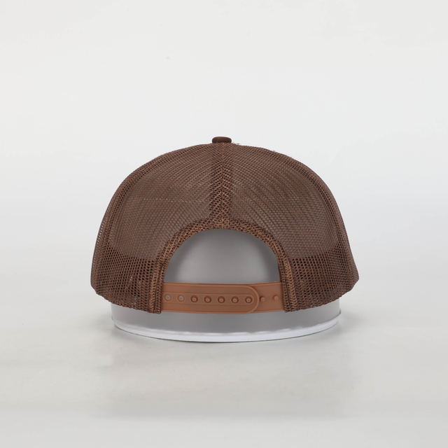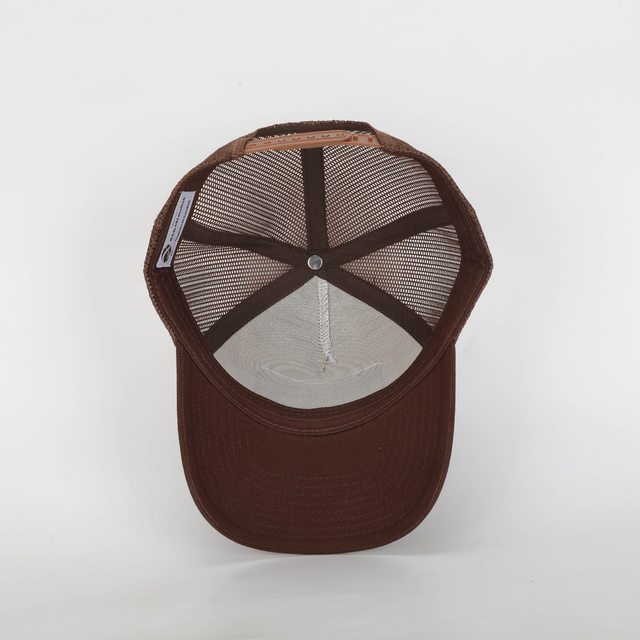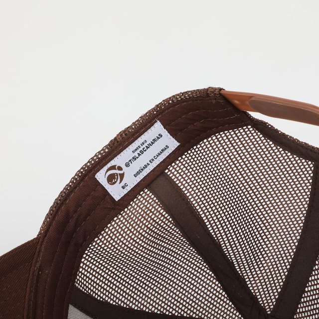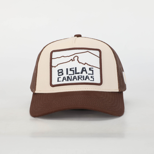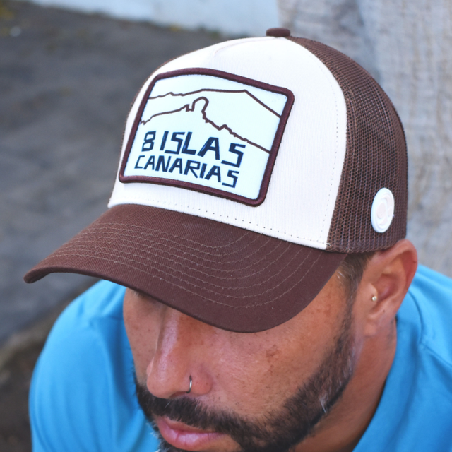 Gorra 8 Islas Canarias marrón. Unisex, estilo trucker con parche bordado. Composición - Frontal y Visera: 100% algodón. Malla: 100% Polyester. Parche lateral: 100% Silicona. Diseñada en las Islas Canarias.