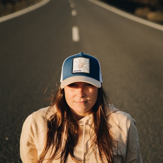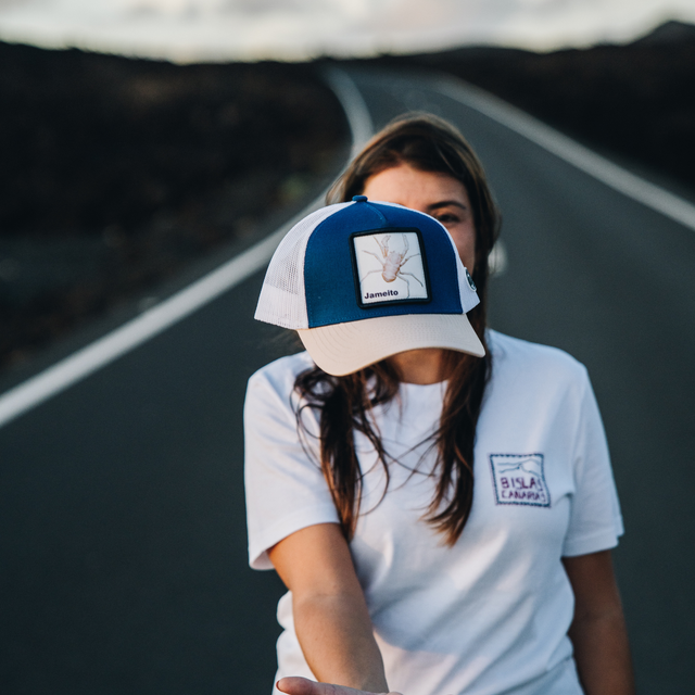 Pertenece a la colección "Símbolos animales de las Islas Canarias". Esta gorra contiene el símbolo animal de la isla de Lanzarote, el jameito. Es un cangrejo endémico de la isla de Lanzarote. Solo habita en algunos jameos, como los famosos Jameos del Agua, por lo que se encuentra en grave peligro de extinción.