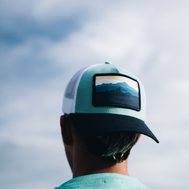 Gorra 8 Islas Canarias silueta cian. Se representa la silueta del Roque Nublo, en primer plano, y del Teide, al fondo, en una imagen que se puede contemplar en la vida real desde la cumbre de Gran Canaria.
