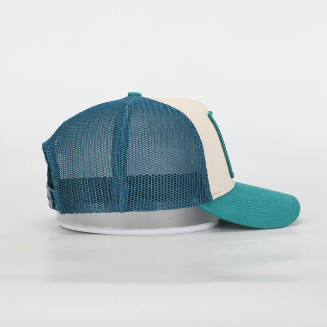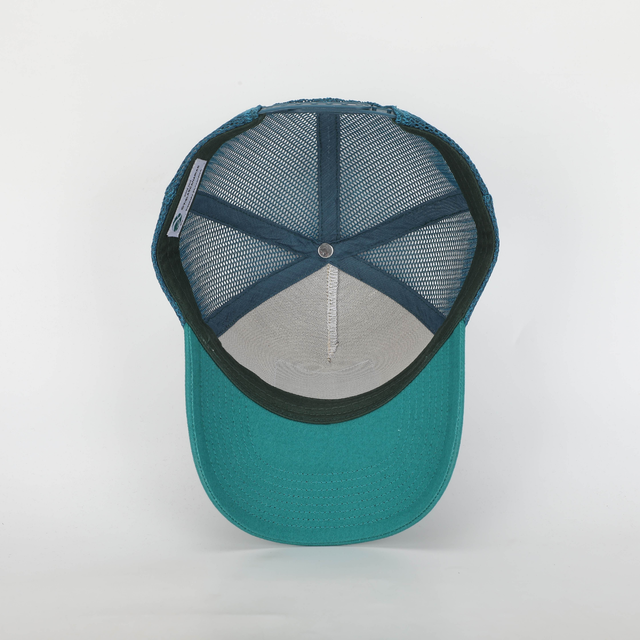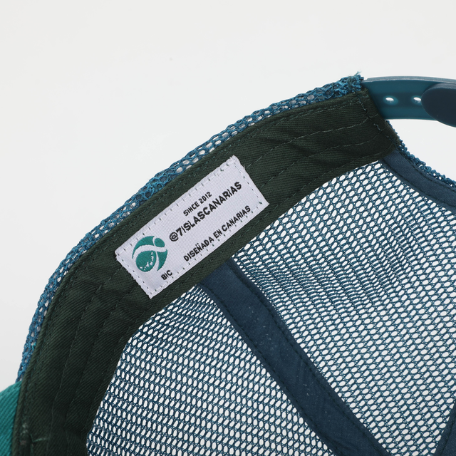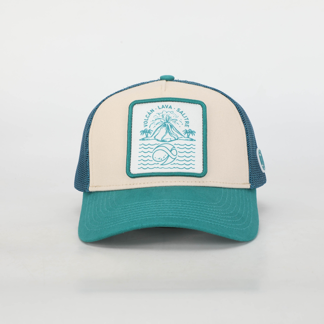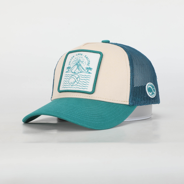 Gorra volcán aguamarina. Unisex, estilo trucker con parche bordado. Composición - Frontal y Visera: 100% algodón. Malla: 100% Polyester. Parche lateral: 100% Silicona. Talla única: 58 cm de circunferencia, ajustable con cierre trasero.