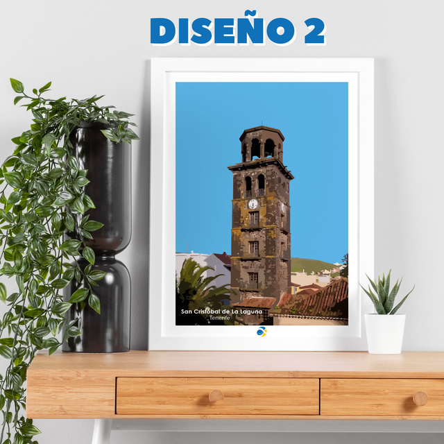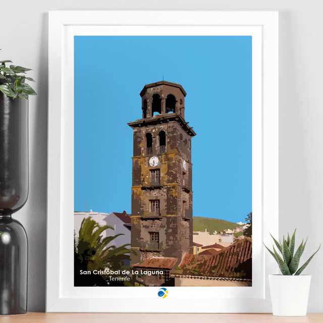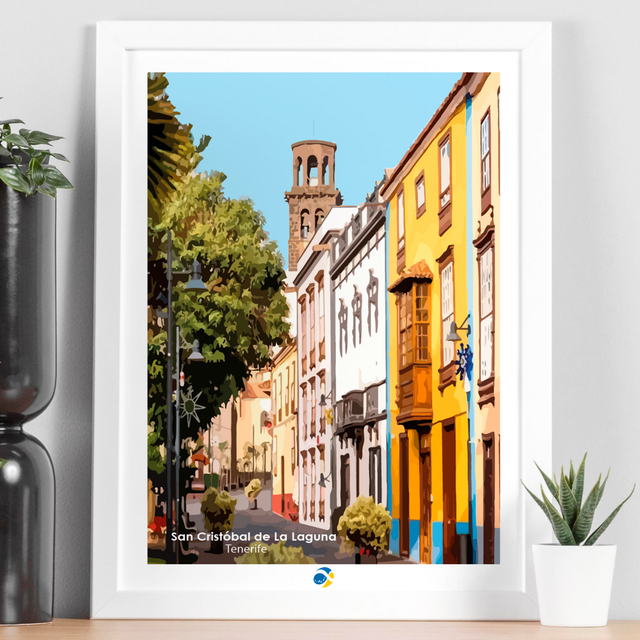 Se representa una calle de San Cristóbal de La Laguna (Tenerife), la calle Agustín y la torre de la iglesia de Nuestra Señora de la Concepción.