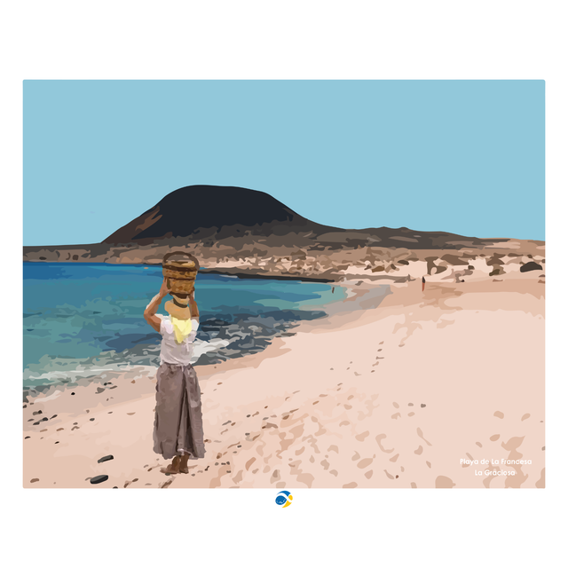 Se representa la playa de La Francesa, en la isla de La Graciosa, considerada una de las mejores playas por sus aguas y su jable, en la zona sur de dicha isla. Se representa, en primer plano, a una campesina cargando mercancía, en homenaje a las campesinas conejeras y gracioseras que cruzaban desde Lanzarote hasta La Graciosa, y viceversa, para comercializar sus productos.