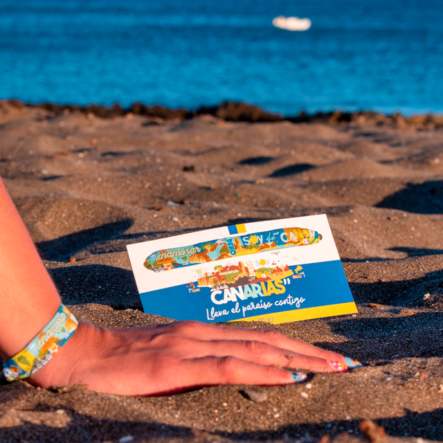 Pulsera de tela con simbología representativa de las Islas Canarias. Viene presentada sobre una tarjeta, con la explicación de los elementos que aparecen en ella, y con cierre de bolita. Se puede mojar sin problema.