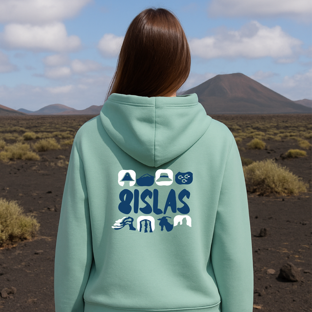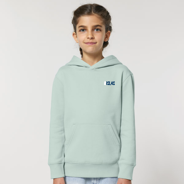 Sudadera con capucha y bolsillo delantero, color aguamarina, con diseño frontal pequeño a la altura del pecho y diseño trasero grande.