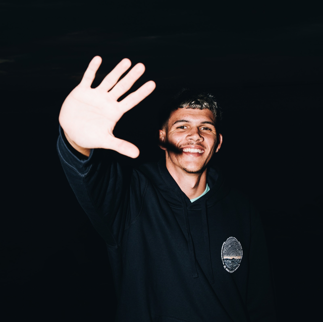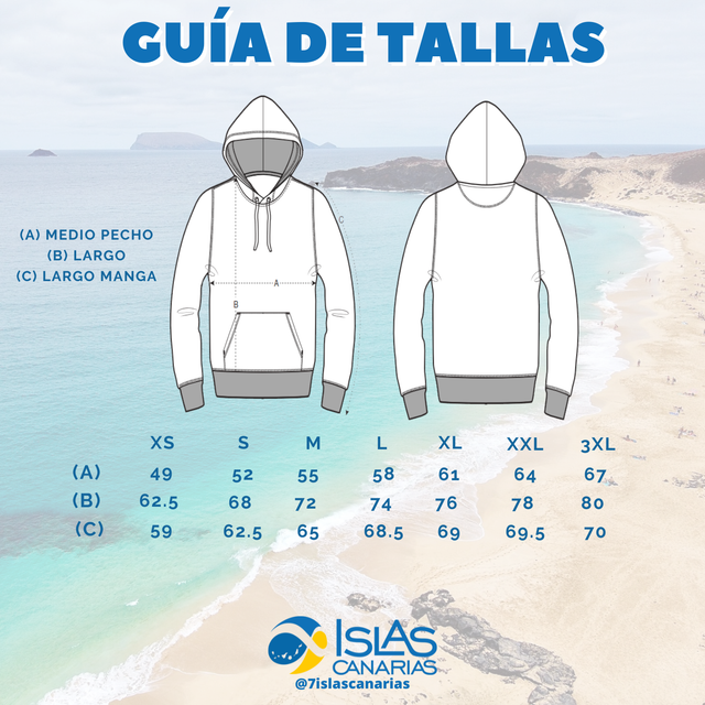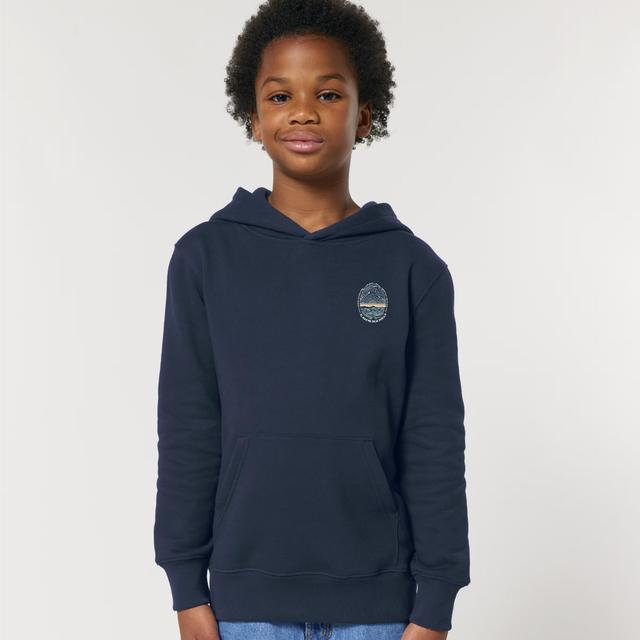 Sudadera con capucha, color azul marino, con diseño frontal pequeño a la altura del pecho y diseño trasero grande. El diseño representa la huella que nos deja el mar, con el Teide al fondo.