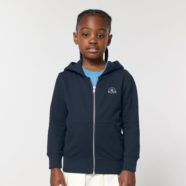 Sudadera con capucha, cremallera delantera y bolsillo delantero, color azul marino, con diseño frontal pequeño a la altura del pecho y diseño trasero grande.